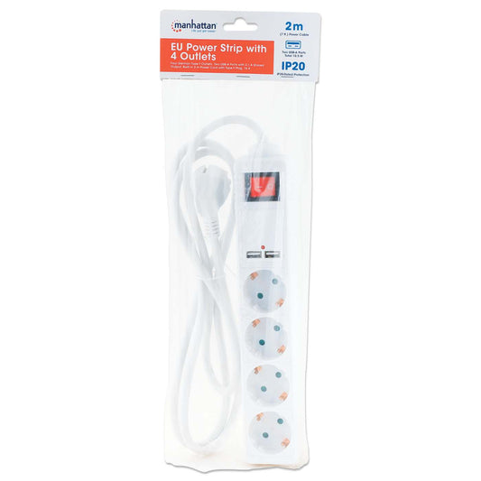 Cuatro tomas de corriente alemanas tipo F, dos puertos USB-A con salida compartida de 2.1 A, cable de alimentación integrado de 2 m con clavija tipo F, 16 A, blancoNúmero de modelo: 168342 -